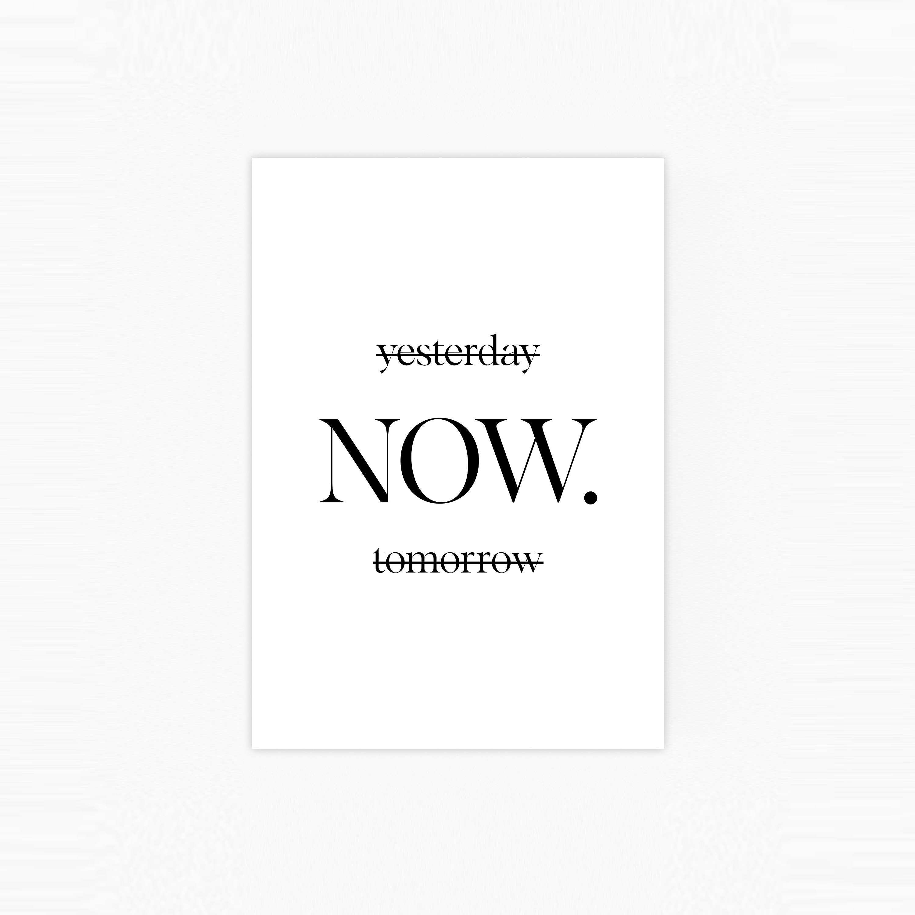 Ein zeitgemäßes und elegantes Poster im typografischen Stil mit dem Text "Yesterday Now tomorrow". Das Poster ist schlicht, aber kraftvoll und ermutigt dazu, die Dinge nicht aufzuschieben und im Hier und Jetzt zu handeln.